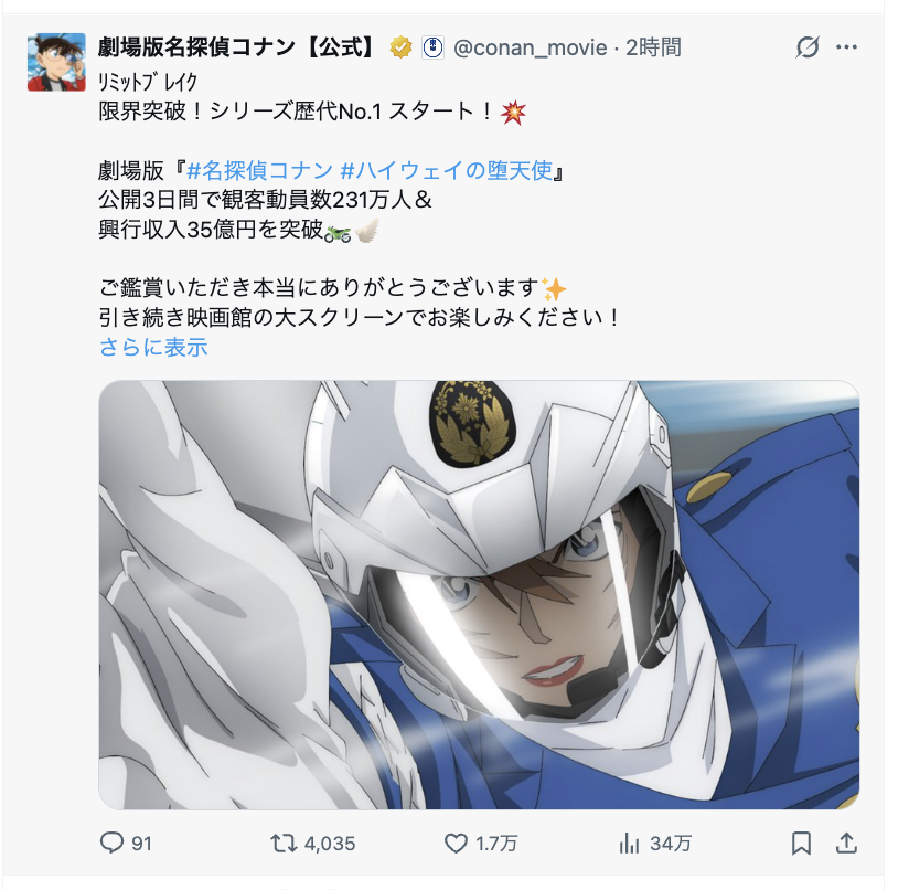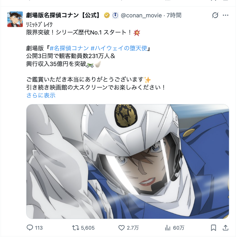 コナン映画『ハイウェイの堕天使』3日で35億円(動員数231万人)の驚異!